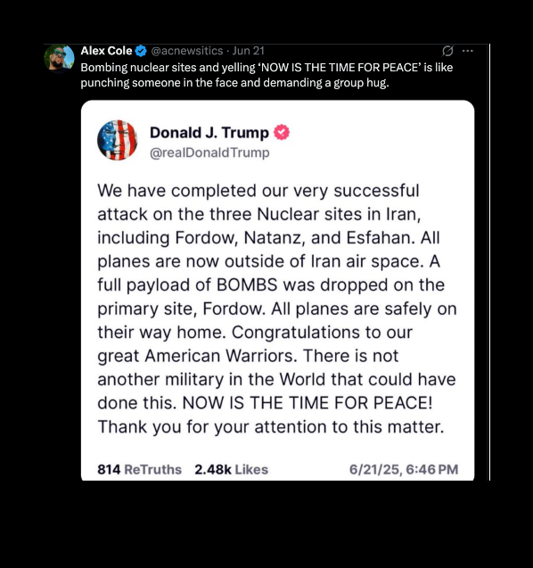 Dropping bombs, then declaring peace is not “Disrupting the Feed” or “Changing the Narrative.” His posts every few hours, with some new B.S. are causing actual terror.